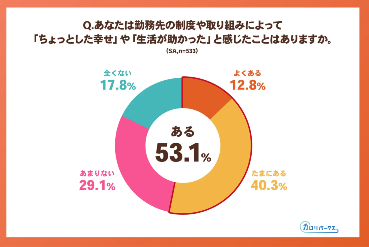 調査によると、福利厚生制度がある企業に勤務する人のうち、53.1%が「ちょっとした幸せや生活の支え」を実感しているという結果が示されています。