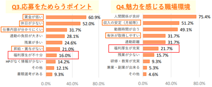 佐賀労働局が2024年12月3日に公表したLINEリサーチの結果では、魅力を感じる職場環境として「福利厚生が充実」を挙げた人が21.7%、応募をためらうポイントとして「福利厚生が不十分」を挙げた人が16.0%でした。