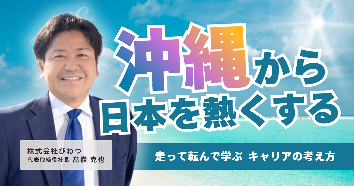 「ビギナーズリンク」で取材・掲載いただきました メディア掲載 2026-02-05 ビギナーズリンク 「沖縄から、日本を熱くする。」株式会社びねつ 髙嶺社長の”走って転んで学ぶ”キャリアの考え方 メディア掲載 お知らせ一覧へ